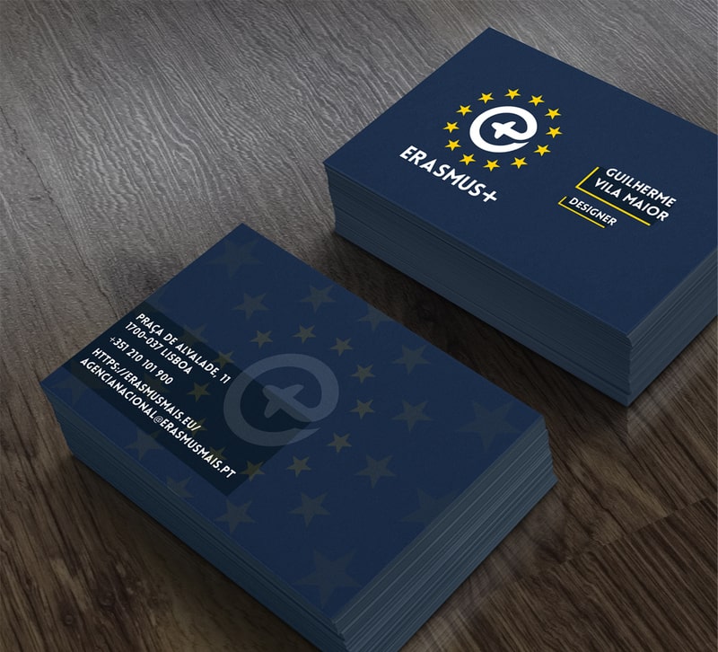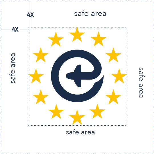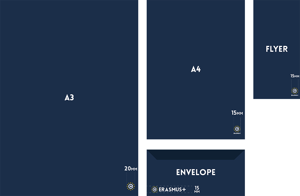The colors for the brand revolve around 3 colors - white, gold and blue - the gold is from the flag’s stars, the blue is in a darker shade of the blue from the flag as well, and lastly the white for the “e” and “erasmus+” for ease of reading and make it pop. The logo can be placed on top of a variety of backgrounds, the colors of the logo may vary depending on the background, however, the stars should always remaing with their golden color (with only one exception), changing only the “e” and the “erasmus+”, switching between white and blue.