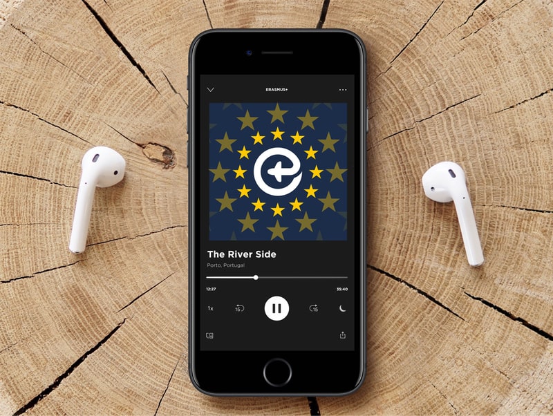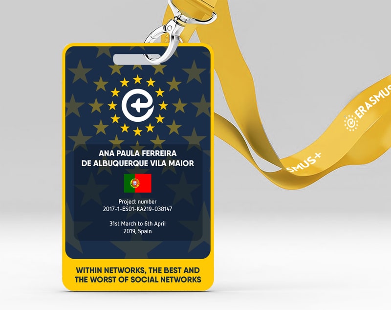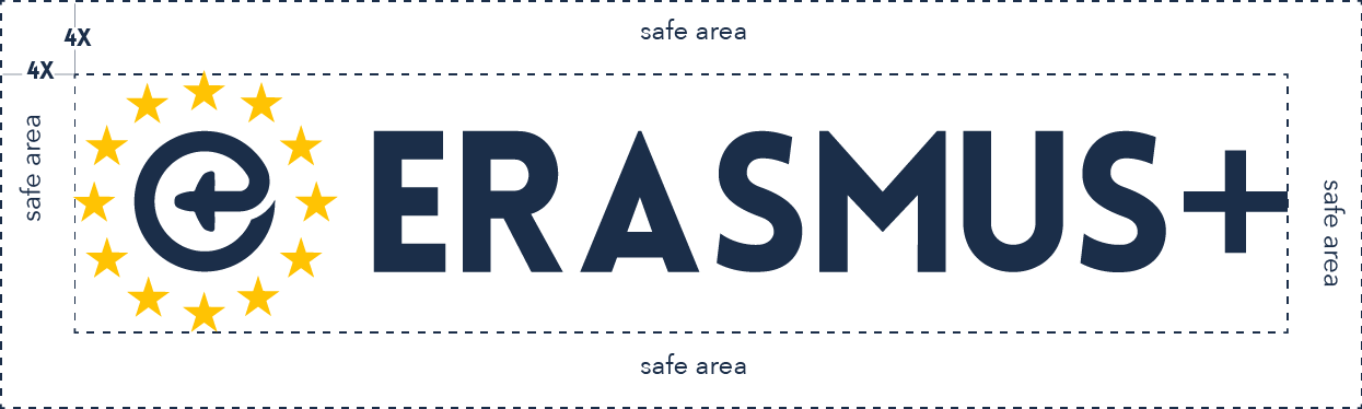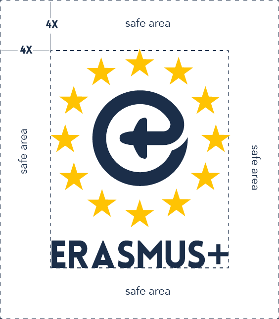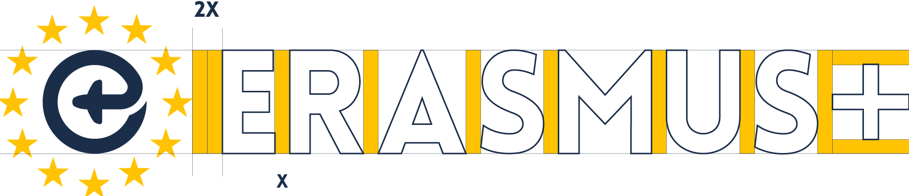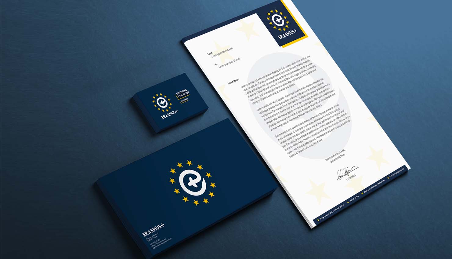 The stars resemble the European foundation on the project, and come from the European Union flag, surrounding the white “e” element, this one coming from the union of an “e”, from “erasmus”, with a plus, in shape of an airplane to represent the internacionality and travelling of the project. To complete the logo, in a written form underneath, there is a written identification of the brand.