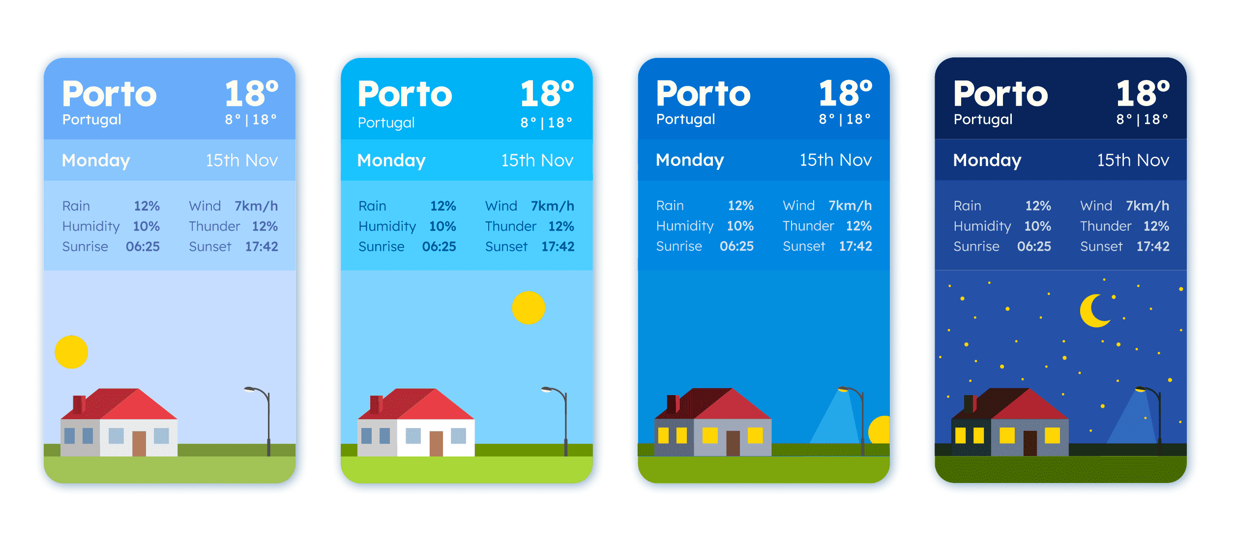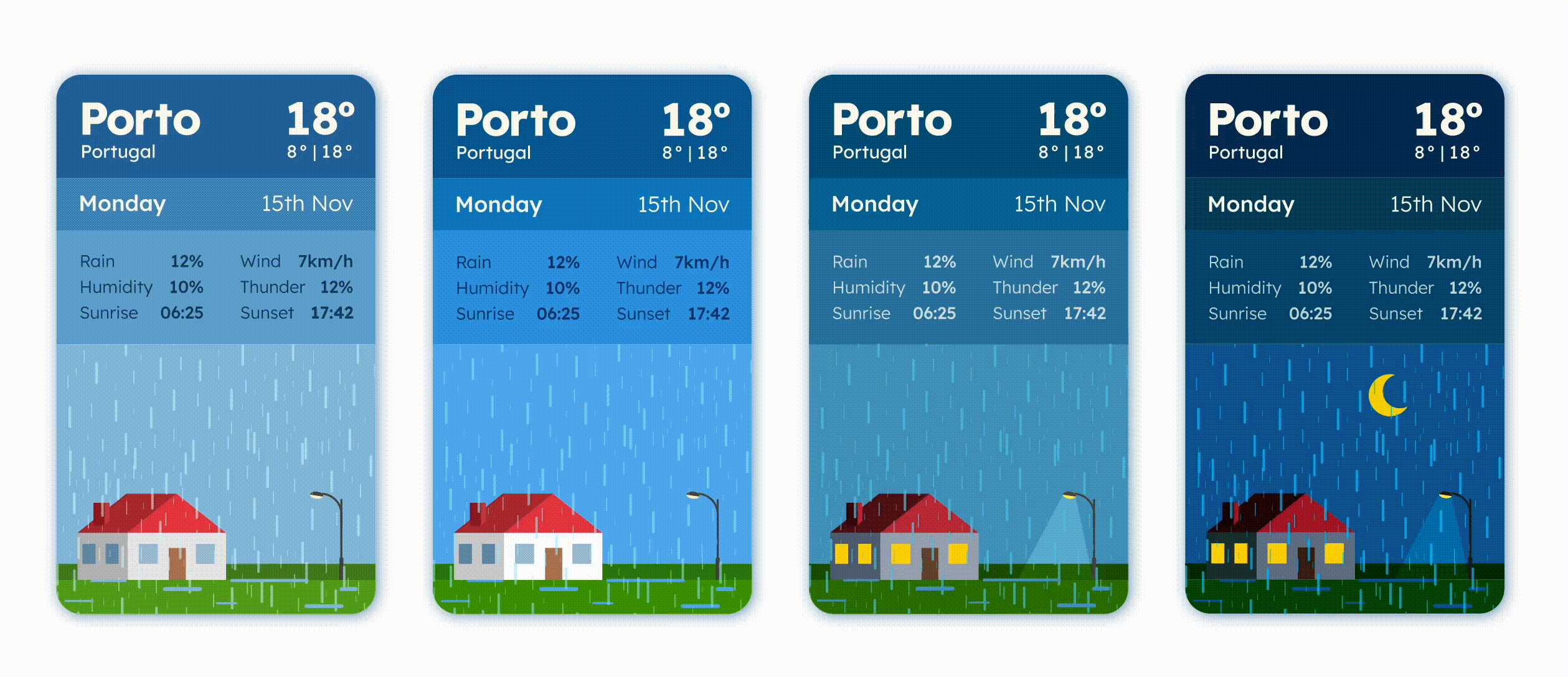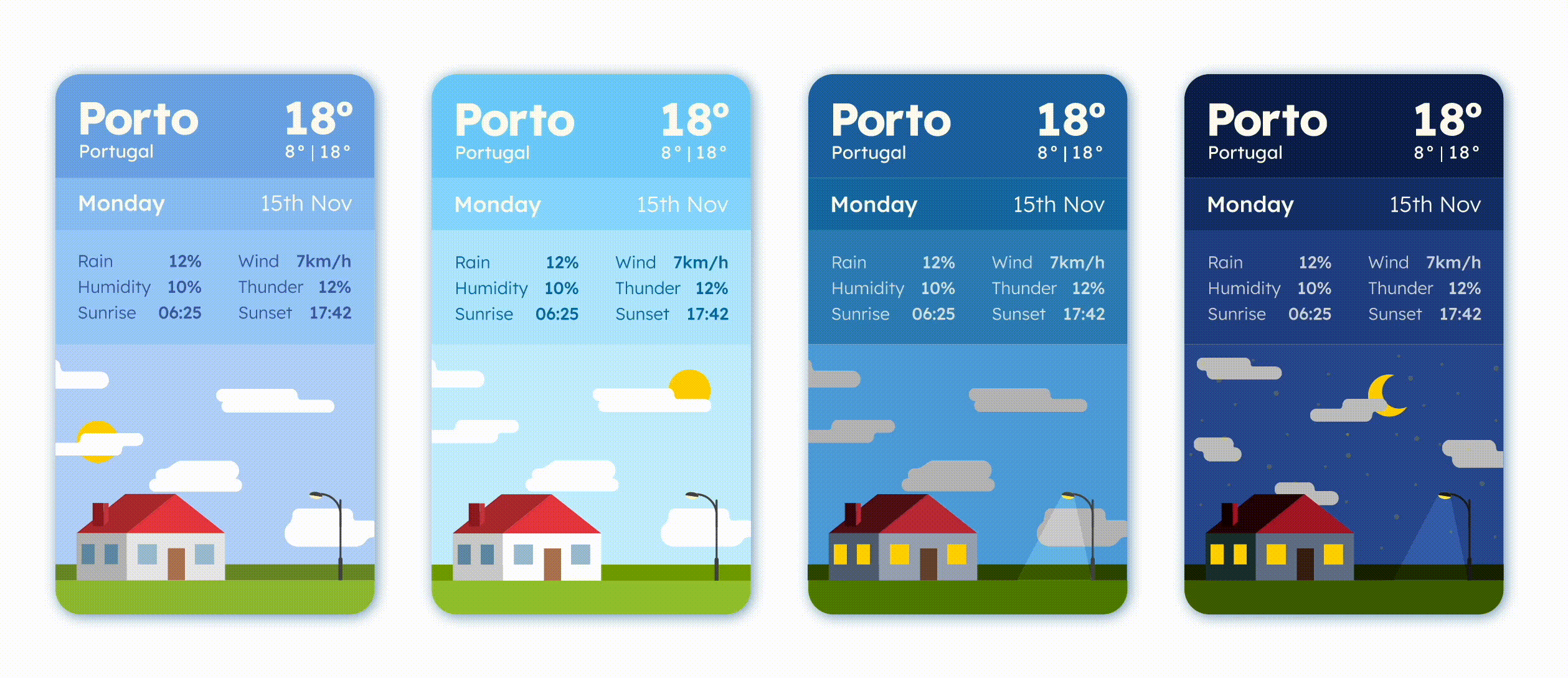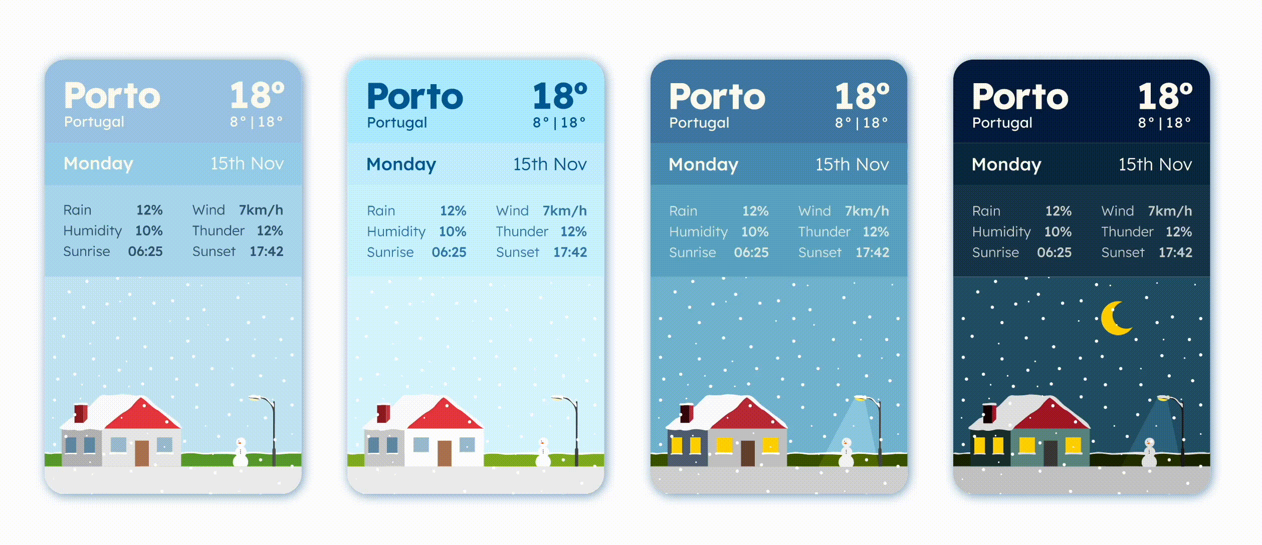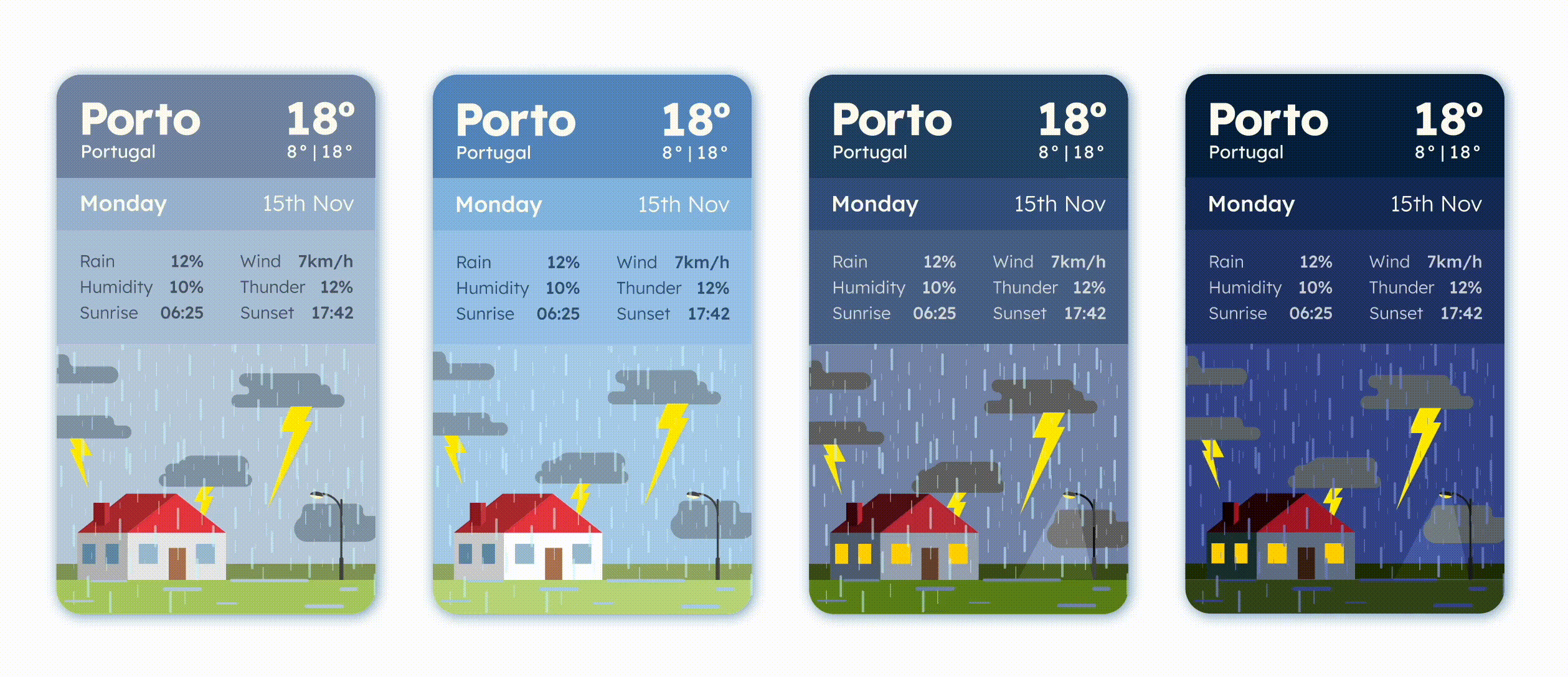 There are 5 different styles of cards (Sunny, Cloudy, Rainy, Snowy and Thunder), each one to be used depending on the player’s current location’s weather. There are multiple short stories for each style of cards, all of those following the same structure, using three types of choice-making: